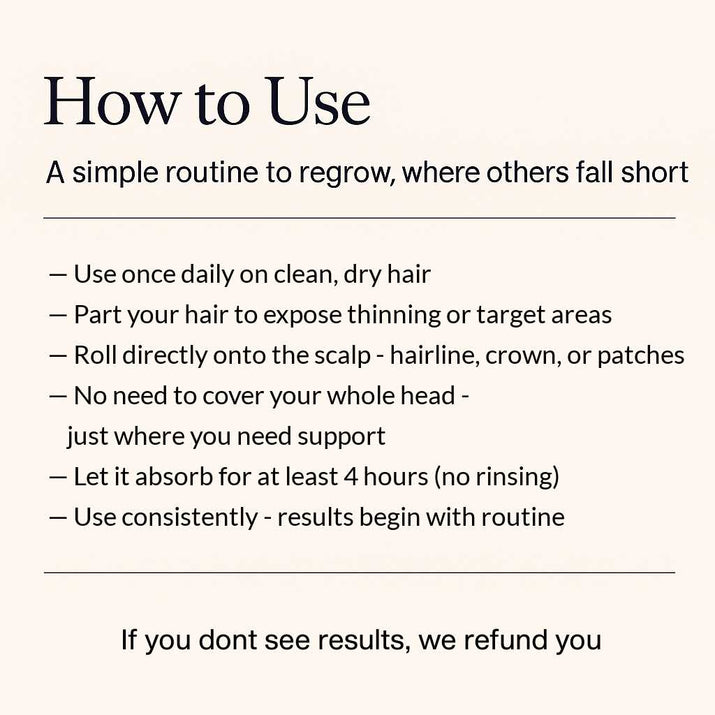 A: Unlike minoxidil, we support natural follicle health, not force an artificial cycle. Many reduce to 2-3x weekly maintenance after 6 months. Consistency matters most in the first 3-6 months.